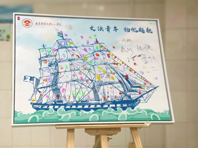 在当晚举办的新生班会中,独特的签到活动也仪式感满满。在寓意着“扬帆起航”的画板上,同学们纷纷按下了自己的手印,文法系辅导员段远方老师携各班班主任也在画板上签字留念。这恰是呵护新生扬帆起航的承诺,也是同学们对大学生活的寄托与无限期待。
