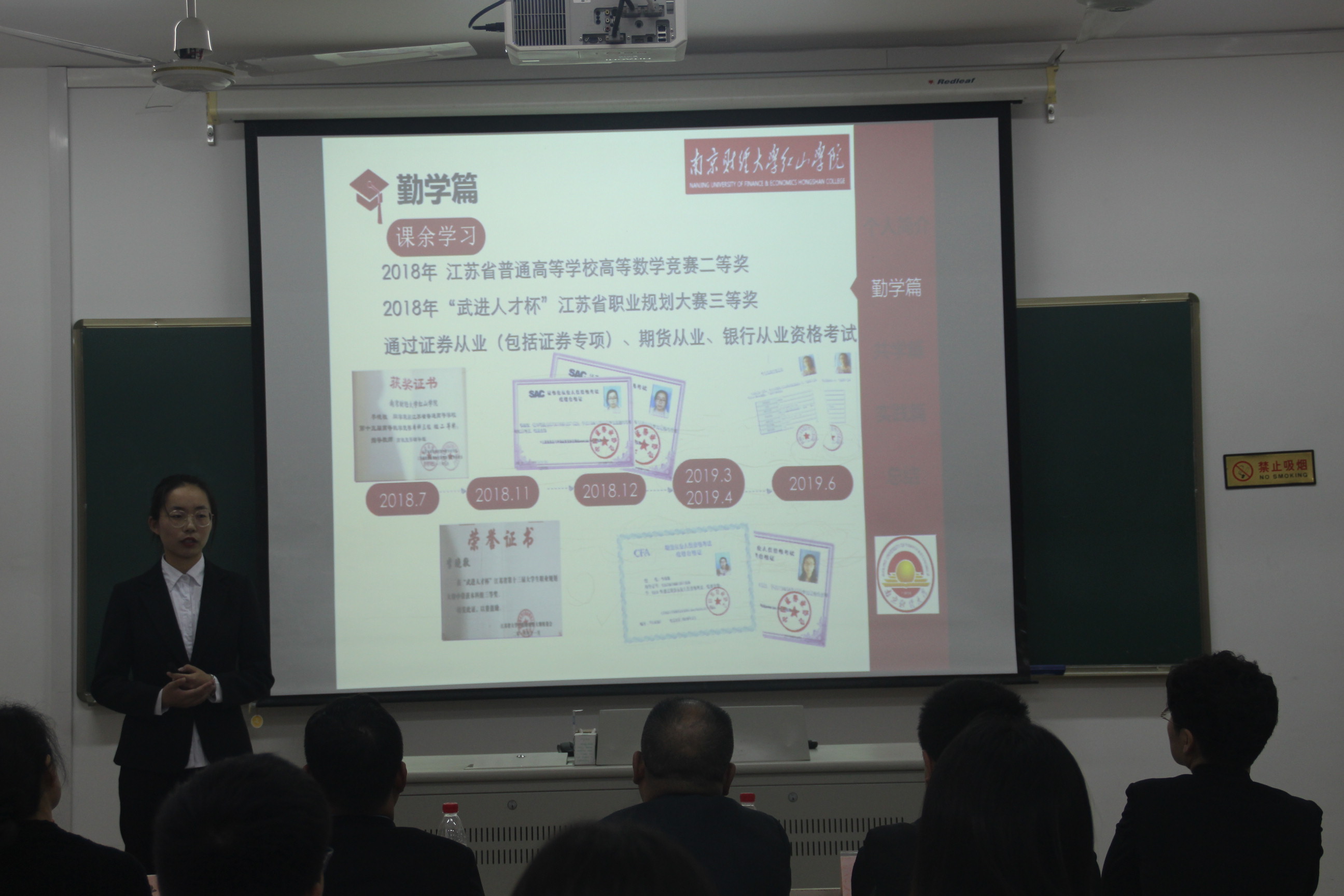 答辩会本着公开、公平、公正的原则进行,根据事先抽签顺序,每位答辩者进行5分钟陈述。他们结合精心准备的PPT,积极展示自己在专业学习、团学活动、科研竞赛、社会实践等方面取得的成绩。评委现场提问,参评同学就相关问题认真答辩。经过激烈角逐,最终英语1651班尤家莉和法学1752班王连清两位同学脱颖而出,获得2019年度国家奖学金推荐资格。
