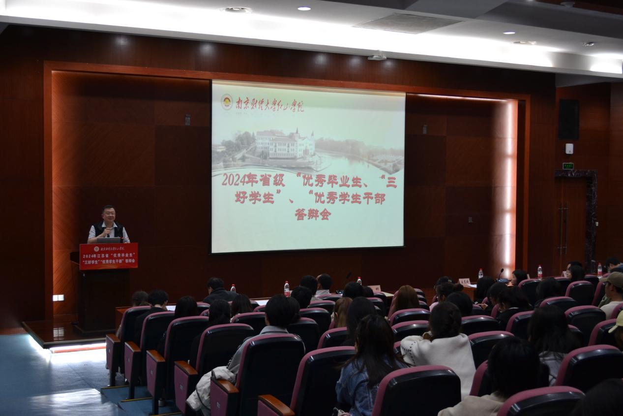 4月19日晚上18:30,万象城在桥头校区四教报告厅举行2024年度江苏省优秀毕业生、三好学生、优秀学生干部评审答辩会。万象城娱乐awc线路桥头校区管委会主任、红山学院党委书记孙彬,党委副书记、副院长王晨婷,党委副书记、纪委书记高永东,副院长王晓庆,学生处处长姚学峰、团委书记千继贤出席并担任评委。各系辅导员和学生代表200余人现场观摩。