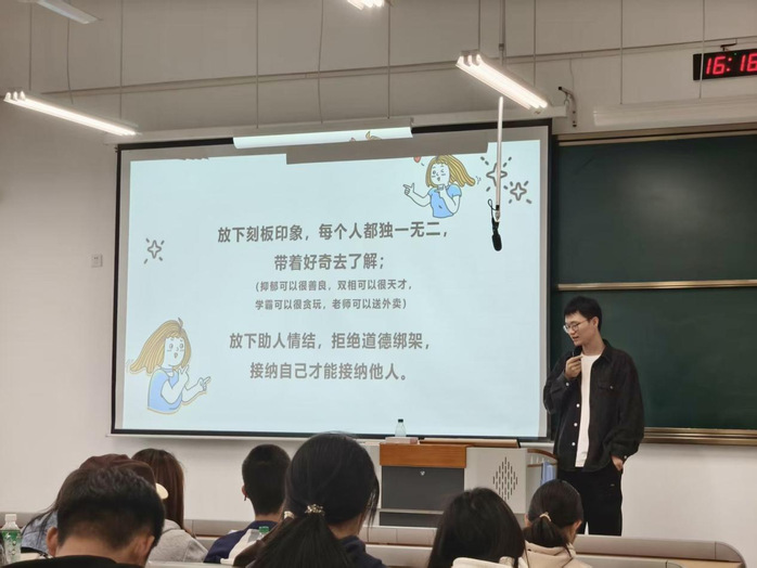在讲座中,王老师首先调查了同学们想要担任心委的原因,并针对“心理委员要心理健康,做班上的示范者”以及“心理委员要有良好的语言能力,善于安慰人”提出了反对与质疑,并向同学们传达了自我接纳,拒绝道德绑架和倾听的重要性。接着着重讲解了心委必须遵守的伦理准则:不伤害原则和保密原则。其次,王老师就心理委员的角色定位进行了详细讲解;同时,深入浅出地讲解了大学生一般心理问题、异常心理问题和心理危机的识别与应对。最后,针对心理委员在日常工作中的沟通技巧和应对方法,王老师与现场同学进行了模拟案例演练和相互练习。