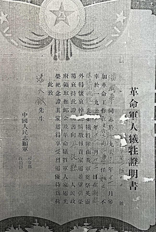 潘国华烈士牺牲证明书