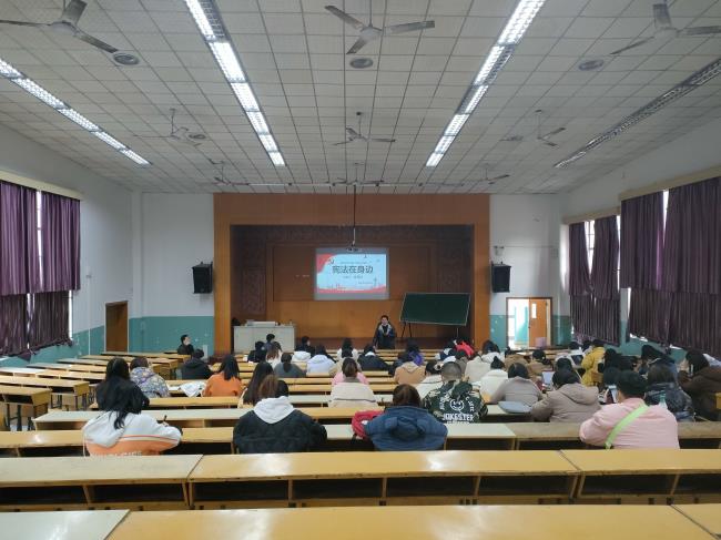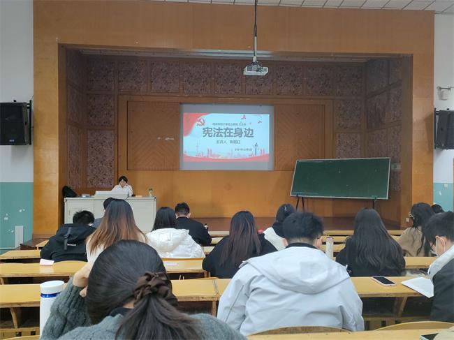 会议由文法系主任助理、文法系党支部宣传委员朱明海主持,朱老师表示:有一种C位叫“一切法律都不得同宪法相抵触”;有一种敬畏叫“宪法圣神不得侵犯”;有一种长情叫“宪法陪伴你一生成长”。