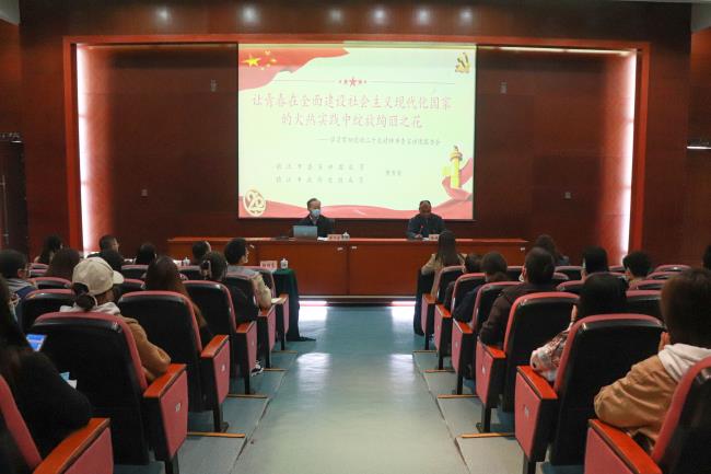 黄万荣以“让青春在全面建设社会主义现代化国家的火热实践中绽放绚丽之花”为题,从“党的二十大的主题和主要成果”“深刻领会过去5年的工作和新时代10年的伟大变革”“深刻领会马克思主义中国化时代化”“深刻领会中国式现代化的中国特色和本质要求”“深刻领会全面建设社会主义现代化国家的目标任务”“深刻领会坚持党的全面领导和全面从严治党的重要要求”“深刻领会应对风险挑战的能力和勇气”七个方面,对党的二十大精神进行了全面深入解读结合学习宣传贯彻党的二十大精神,黄万荣强调,要认真学习领会党的二十大精神,紧密团结在以习近平同志为核心的党中央周围,高举中国特色社会主义伟大旗帜,全面贯彻习近平新时代中国特色社会主义思想,牢记空谈误国、实干兴邦,坚定信心、同心同德,埋头苦干、奋勇前进,为全面建设社会主义现代化国家、全面推进中华民族伟大复兴而团结奋斗!广大师生党员干部深受教育、深受启发,倍添信心、倍添干劲。